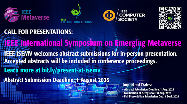 The IEEE International Symposium on Emerging Metaverse (ISEMV 2025), sponsored by the IEEE Metaverse Initiative, aims to contribute to shaping the convergence of the physical and digital worlds as we embark on a journey to understand, realize, and influence the Metaverse. Together, let’s chart a course toward a resilient and technologically enriched future, ensuring sustainable growth and adoption of the Metaverse ecosystem.